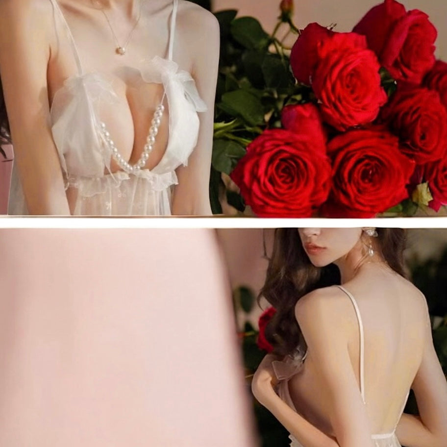 繊細な透け感と、胸元のリボン&パールのアクセントが視線を惹きつける、キャミルームウェア♡