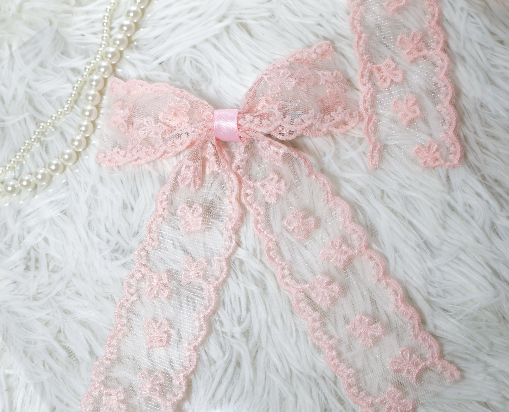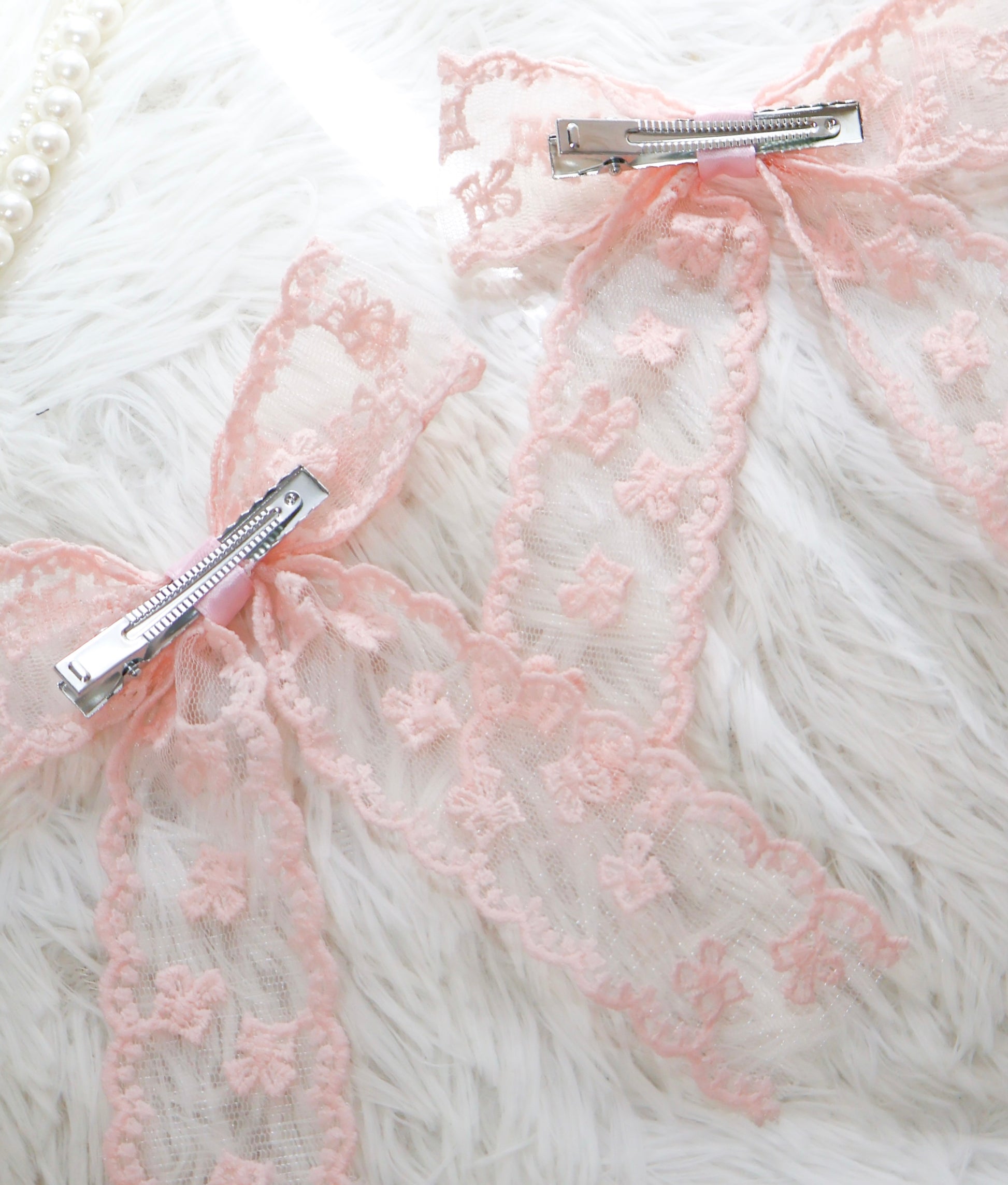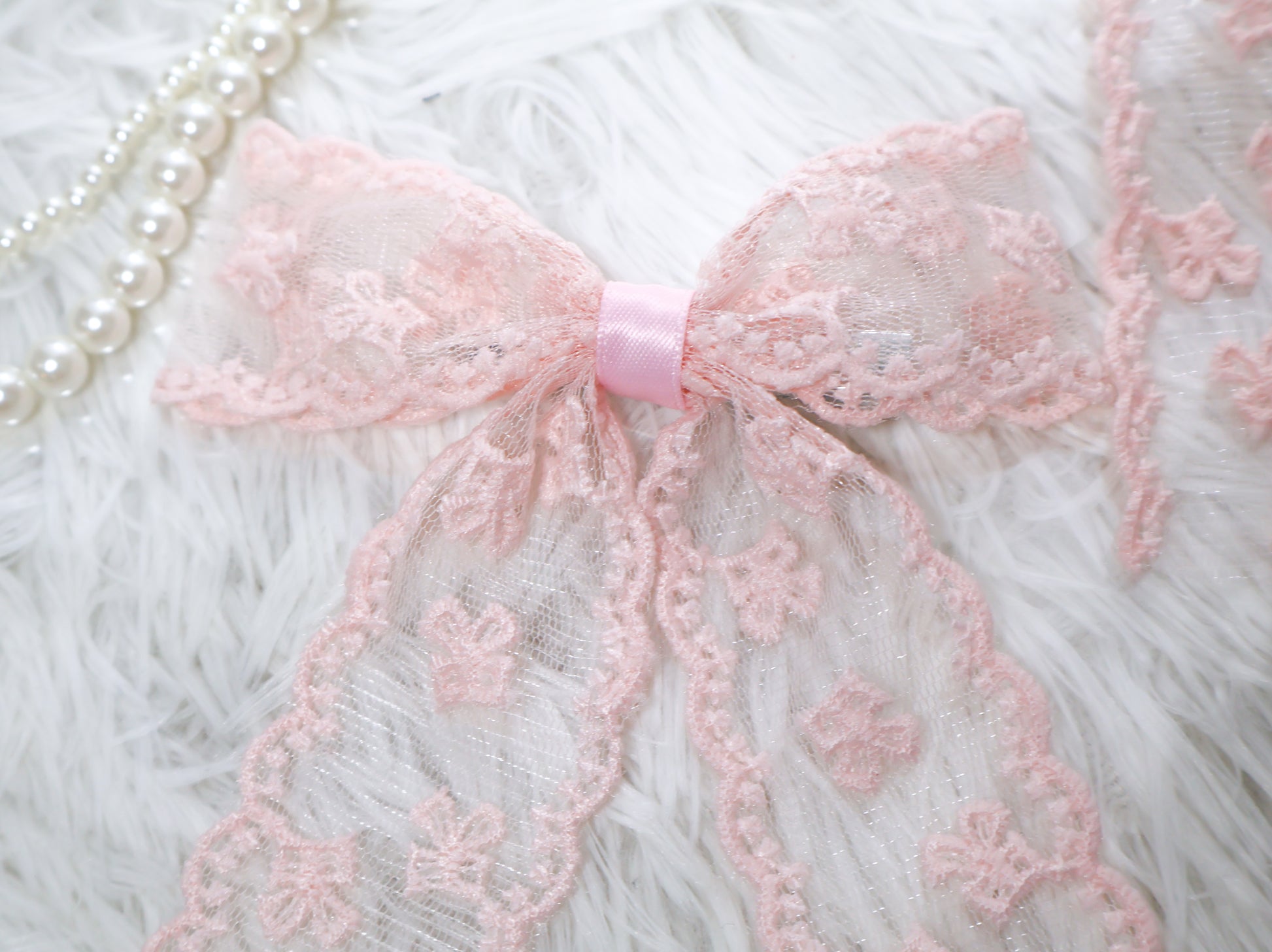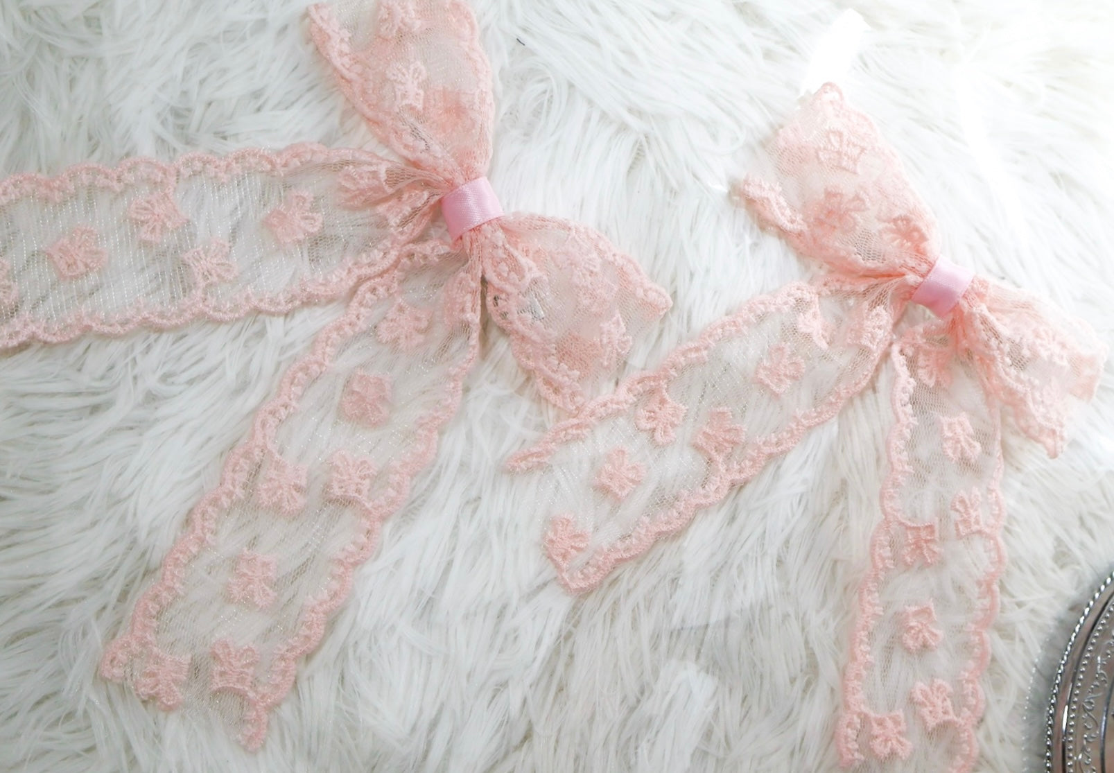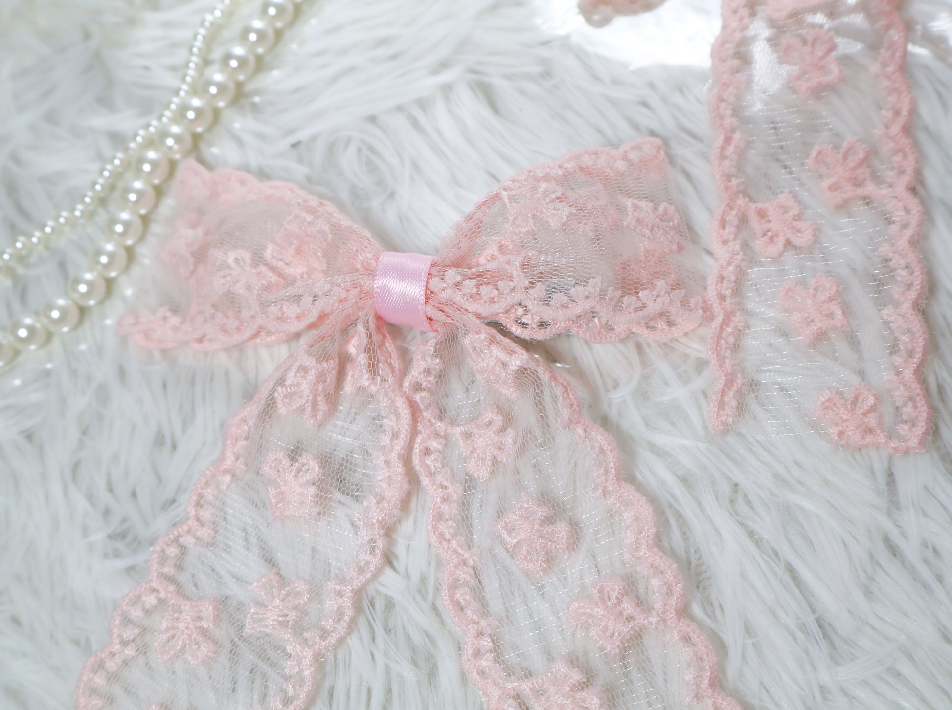 淡く透けるピンクのレースに、波のようなスカラップと小さなリボンモチーフ。