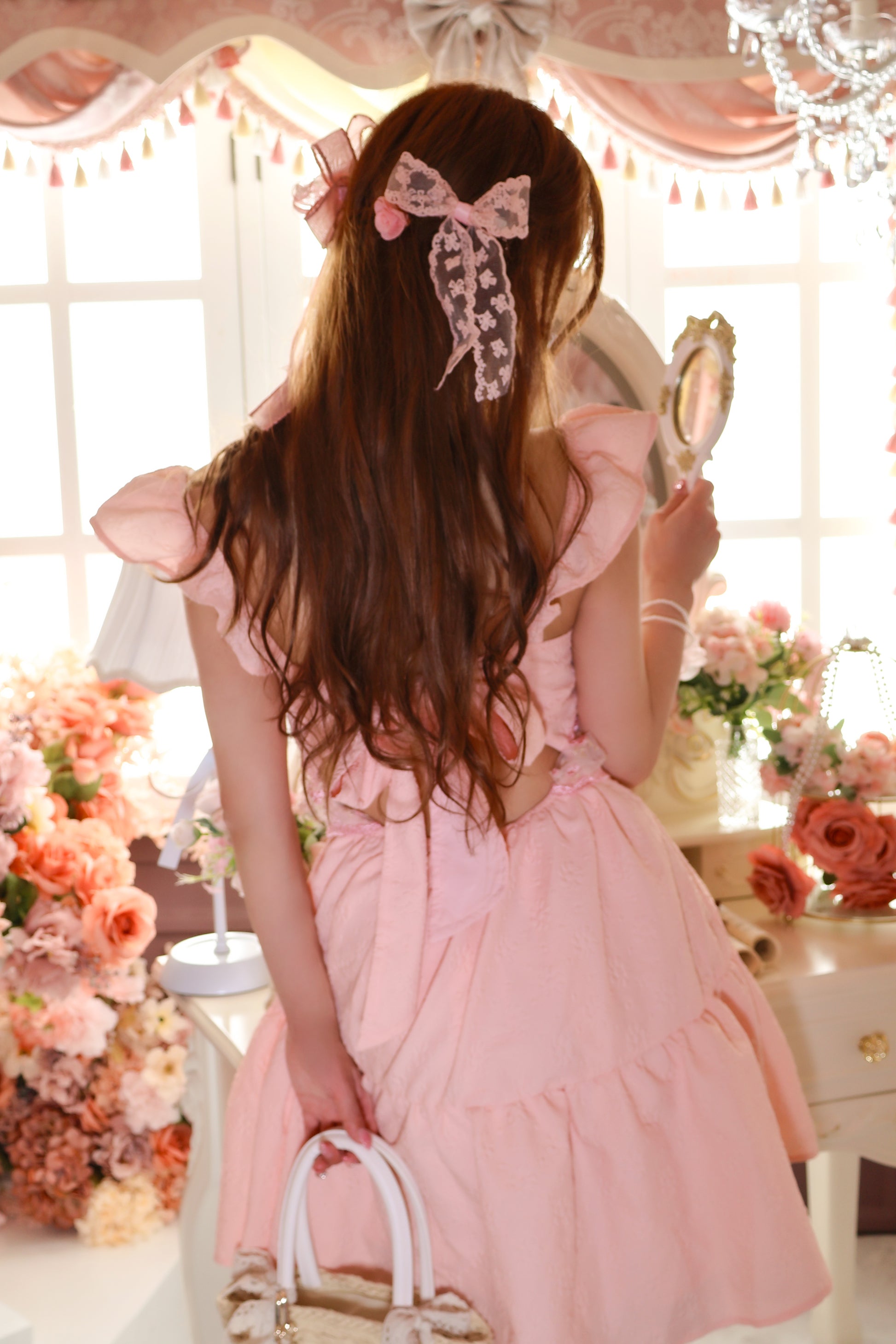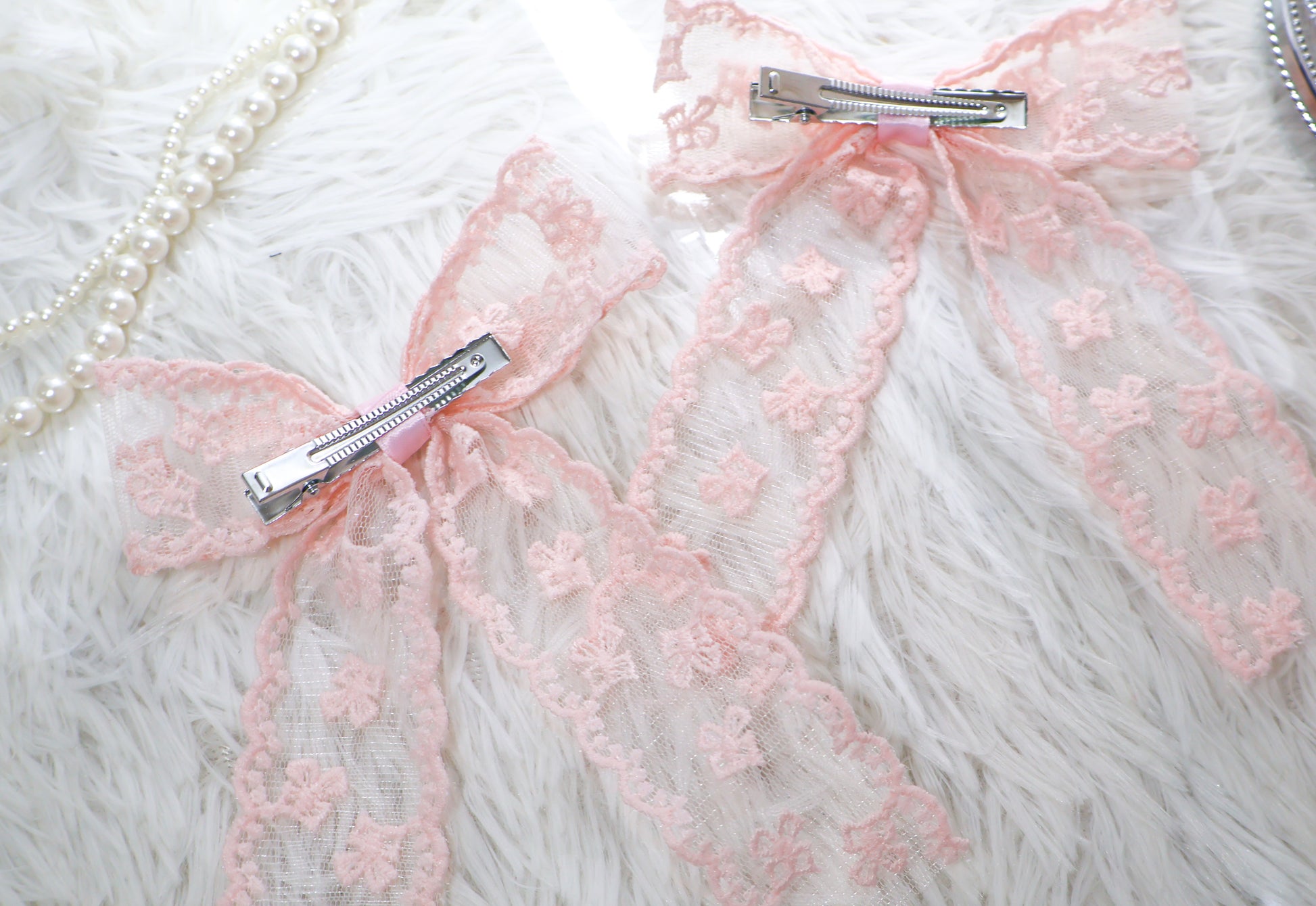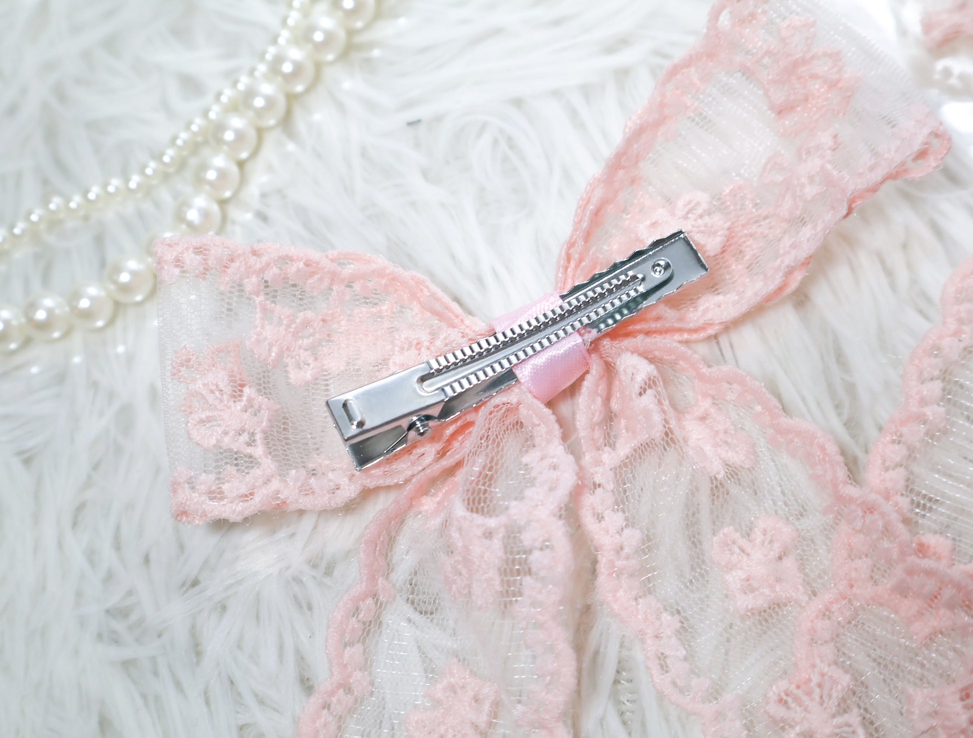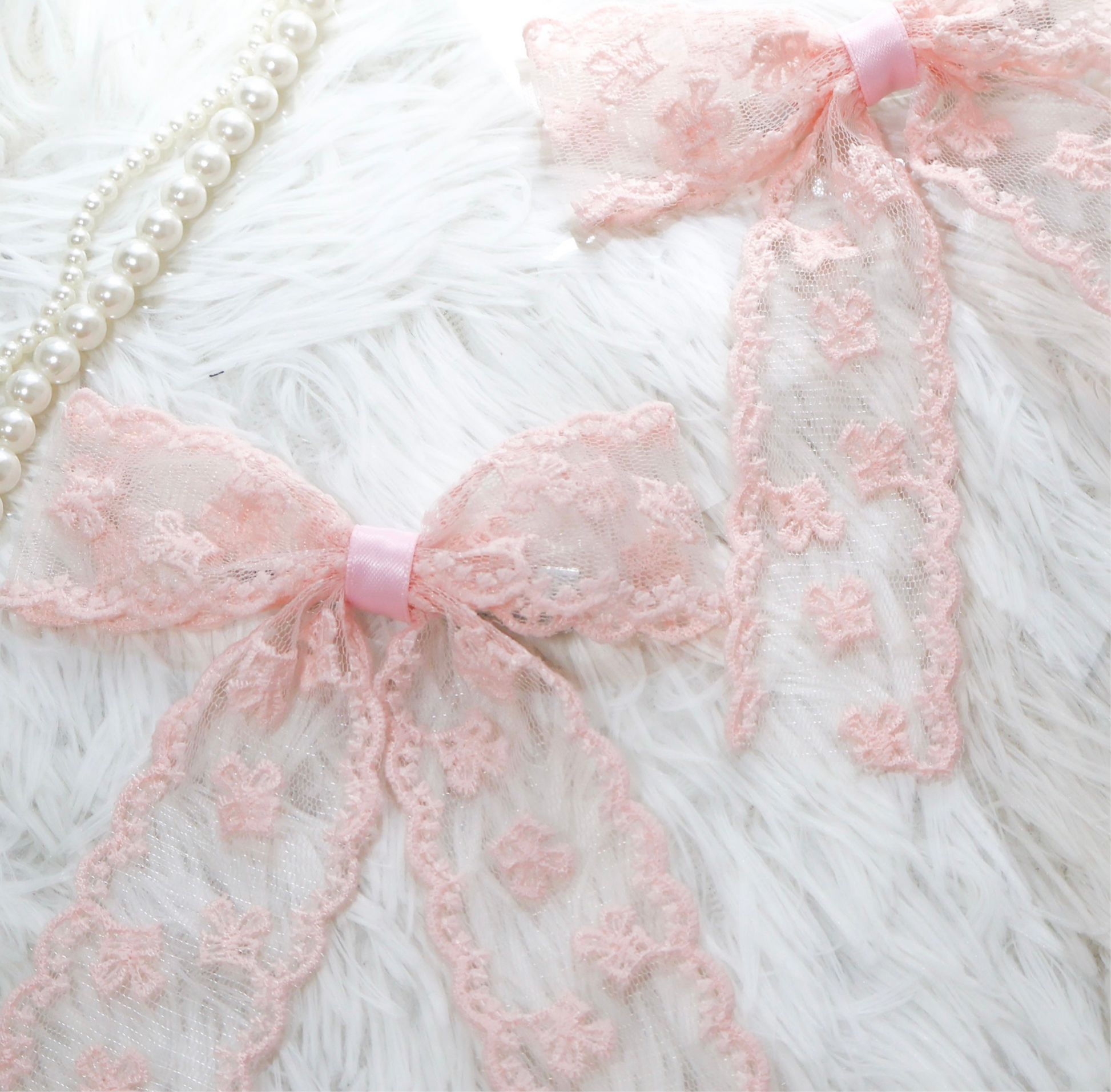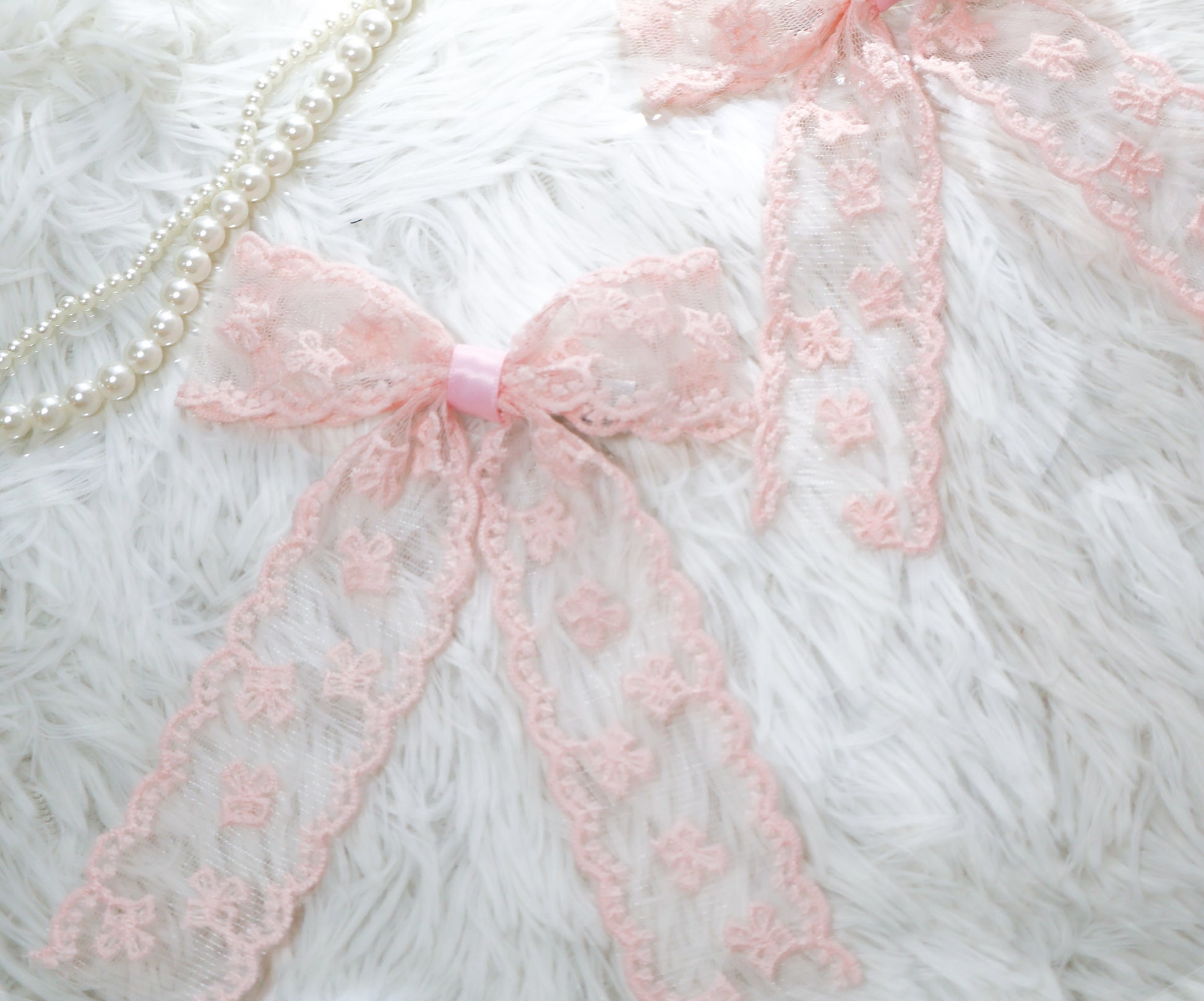 淡く透けるピンクのレースに、波のようなスカラップと小さなリボンモチーフ。