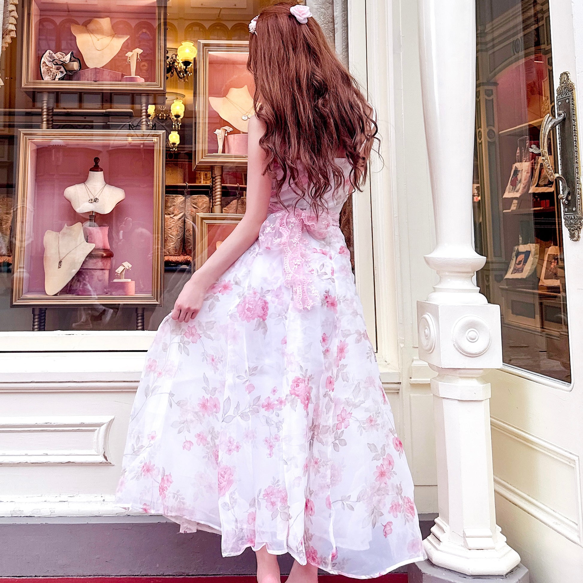 ふんわりと霞がかった朝の花園を思わせる、優雅で儚げな印象のフローラルワンピース。