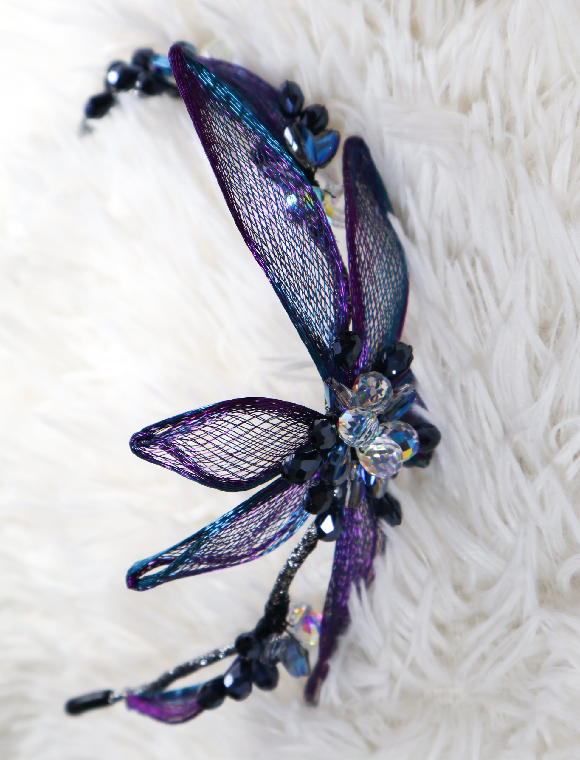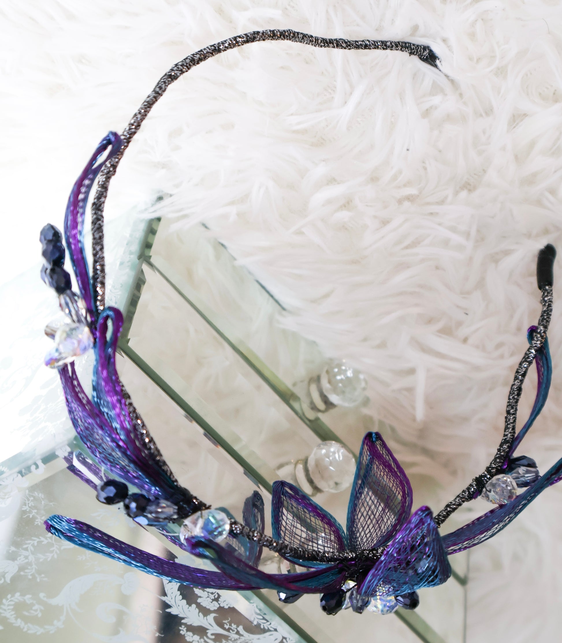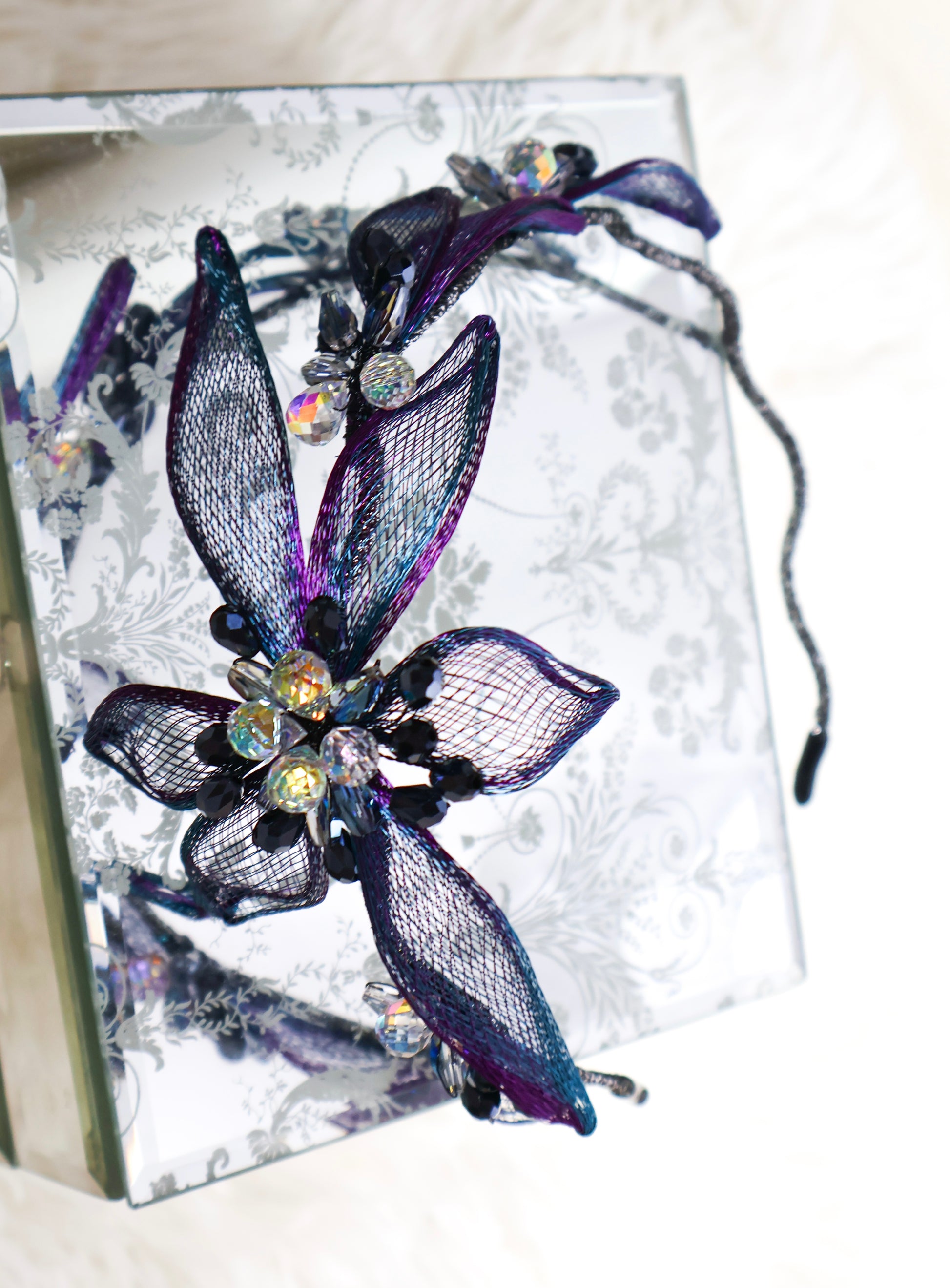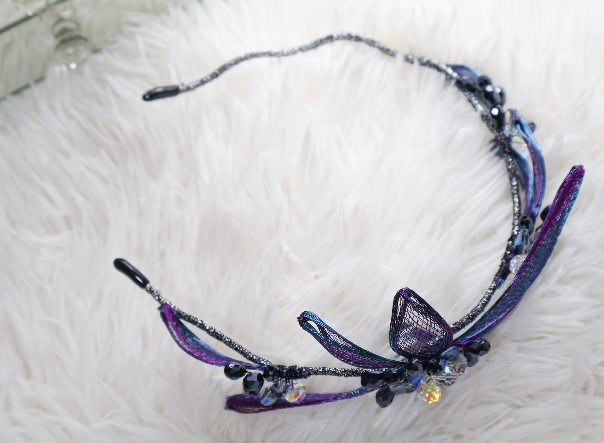 夜空のような深みのあるブルーとパープルのグラデーションに、繊細なラメの花びらと煌めくクリスタルがきらりと輝くカチューシャ。