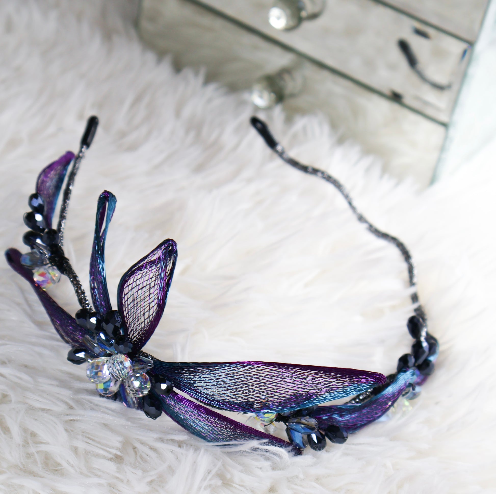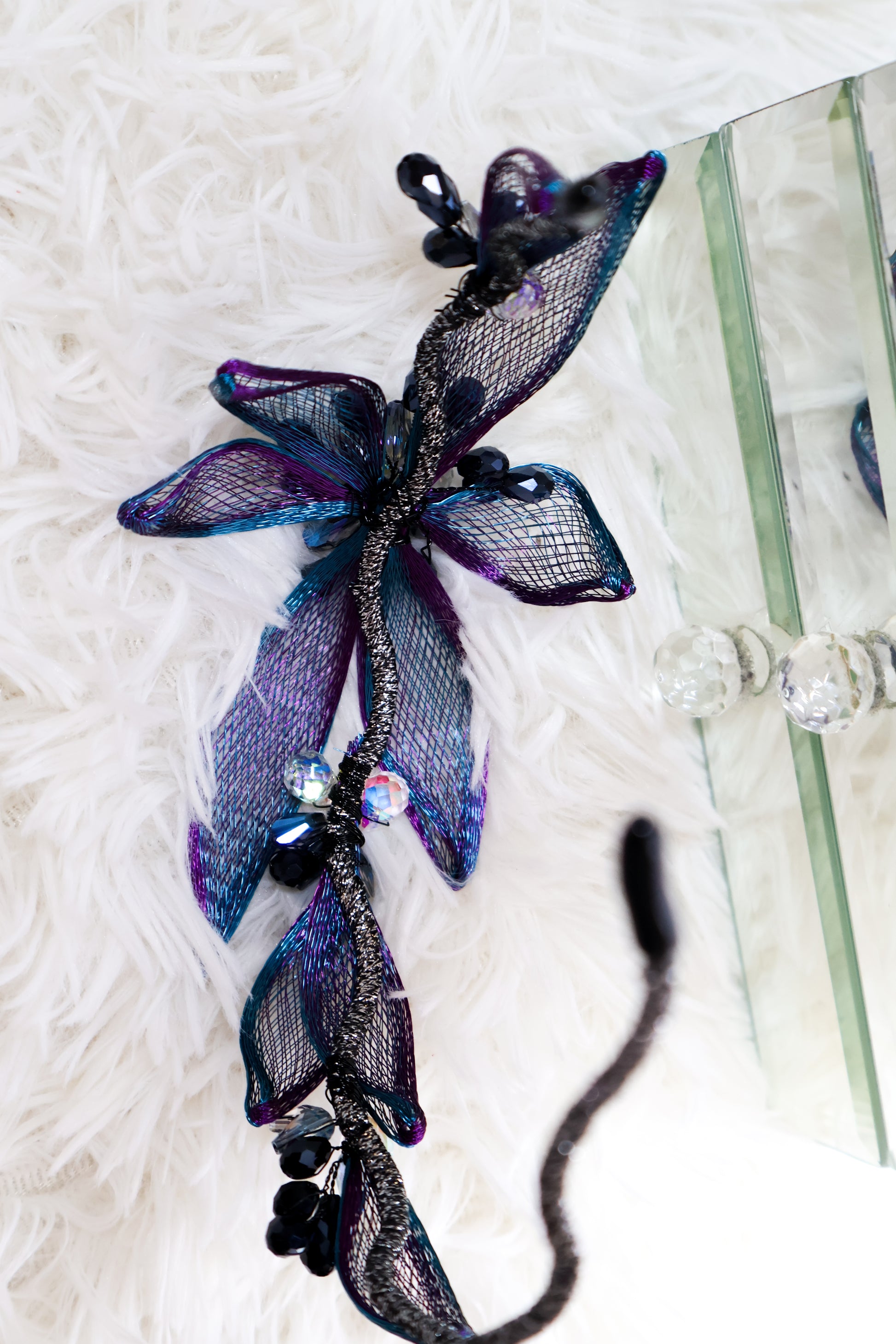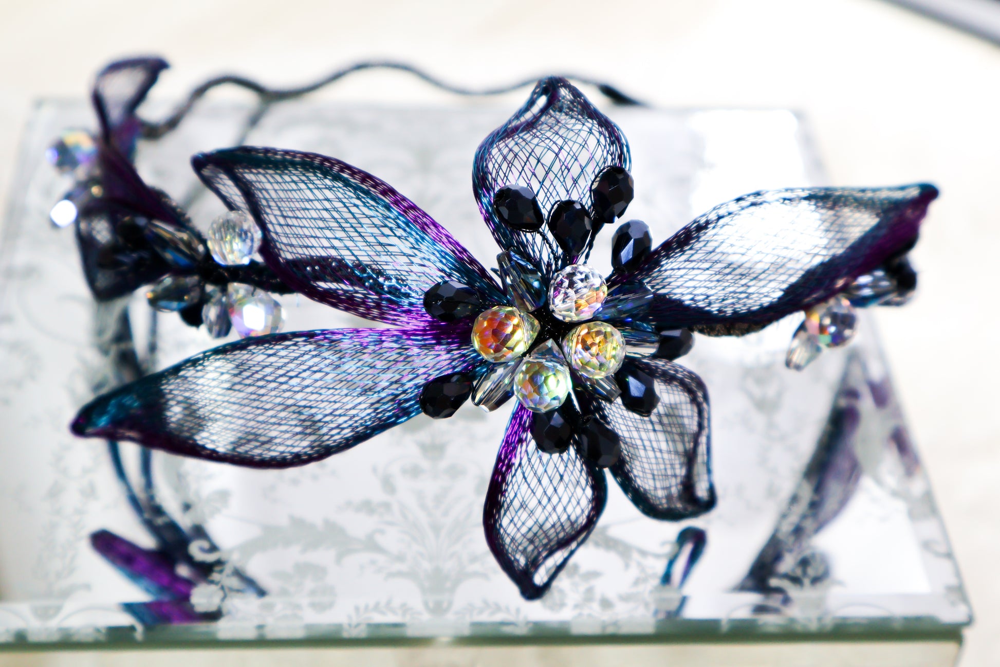 夜空のような深みのあるブルーとパープルのグラデーションに、繊細なラメの花びらと煌めくクリスタルがきらりと輝くカチューシャ。