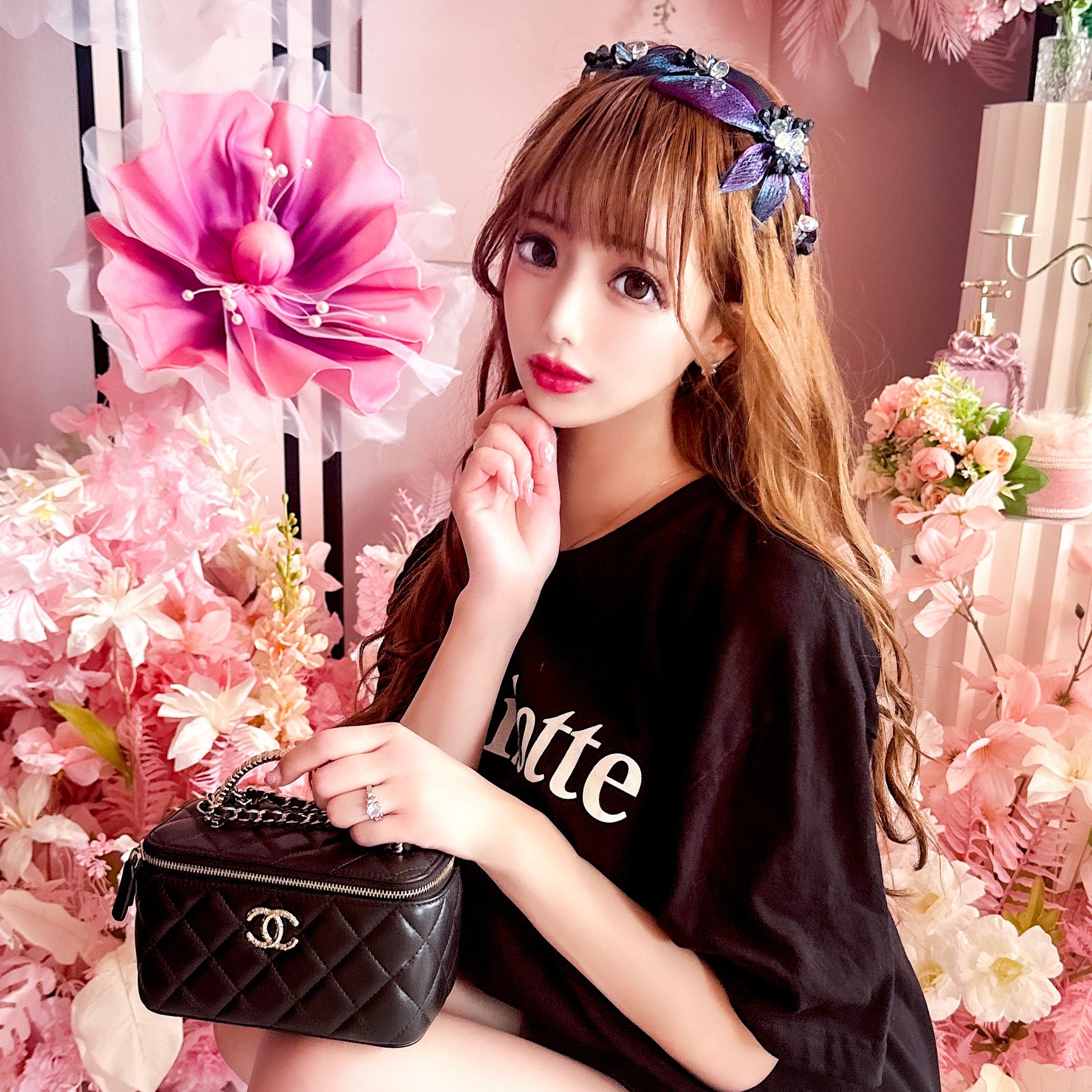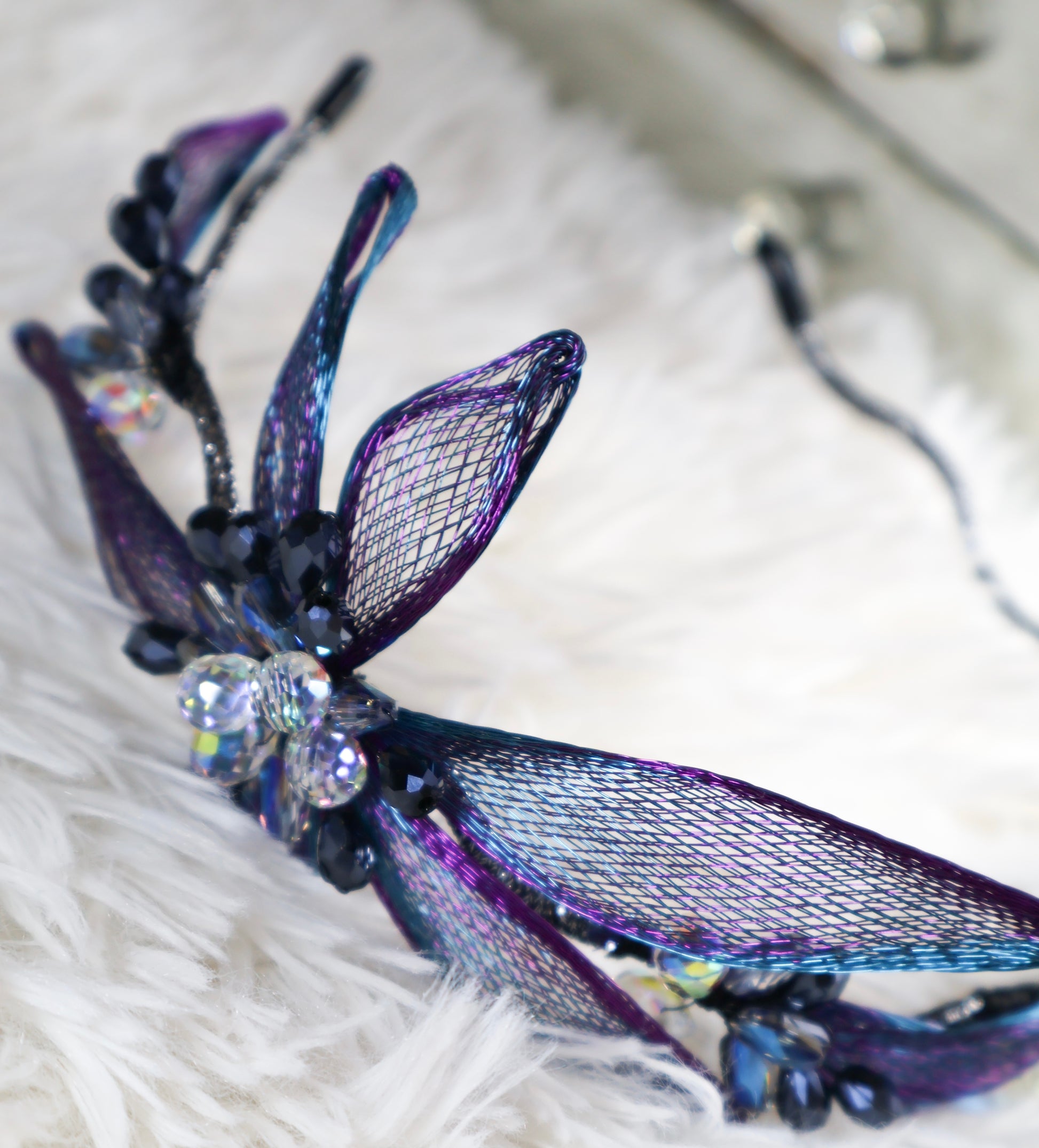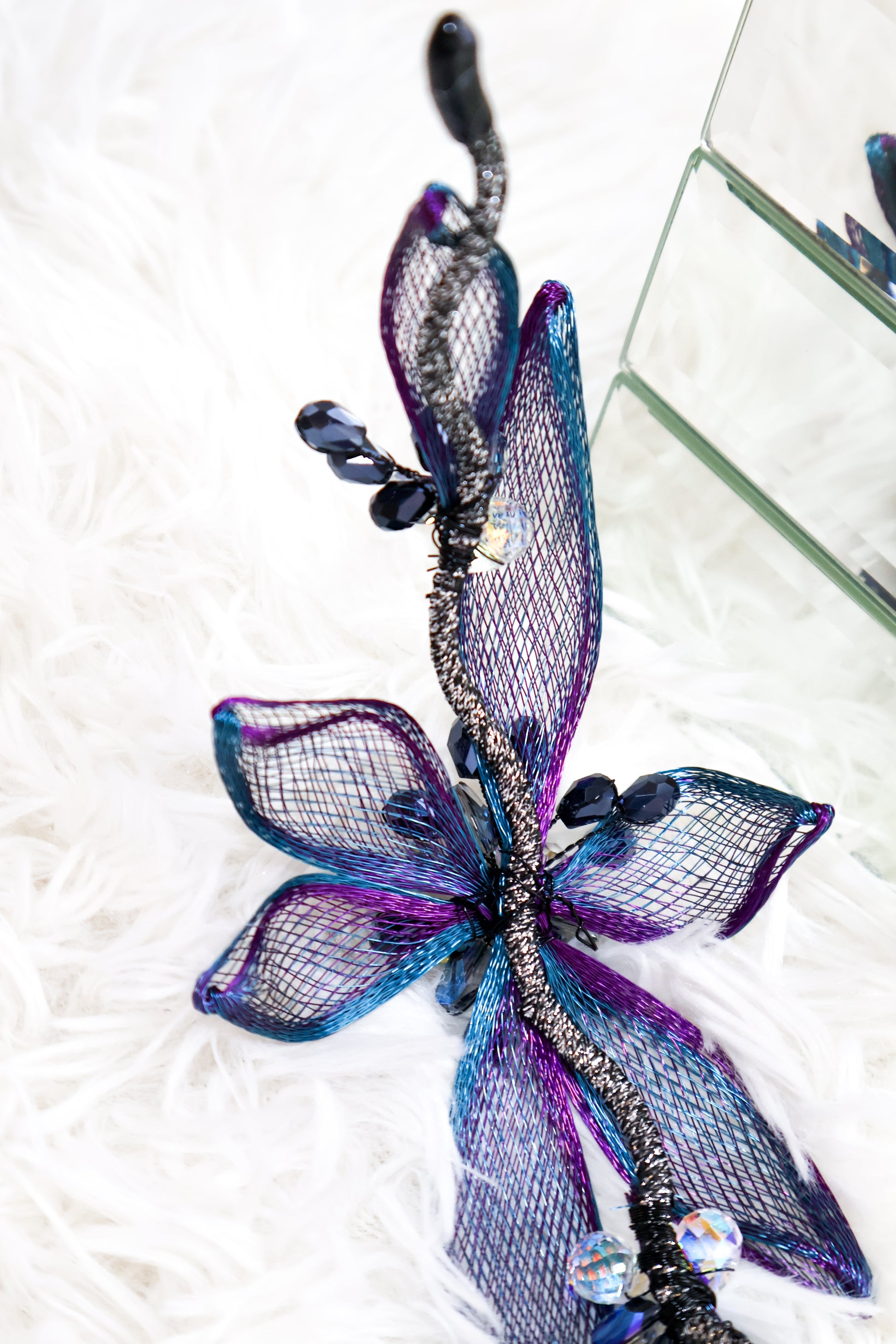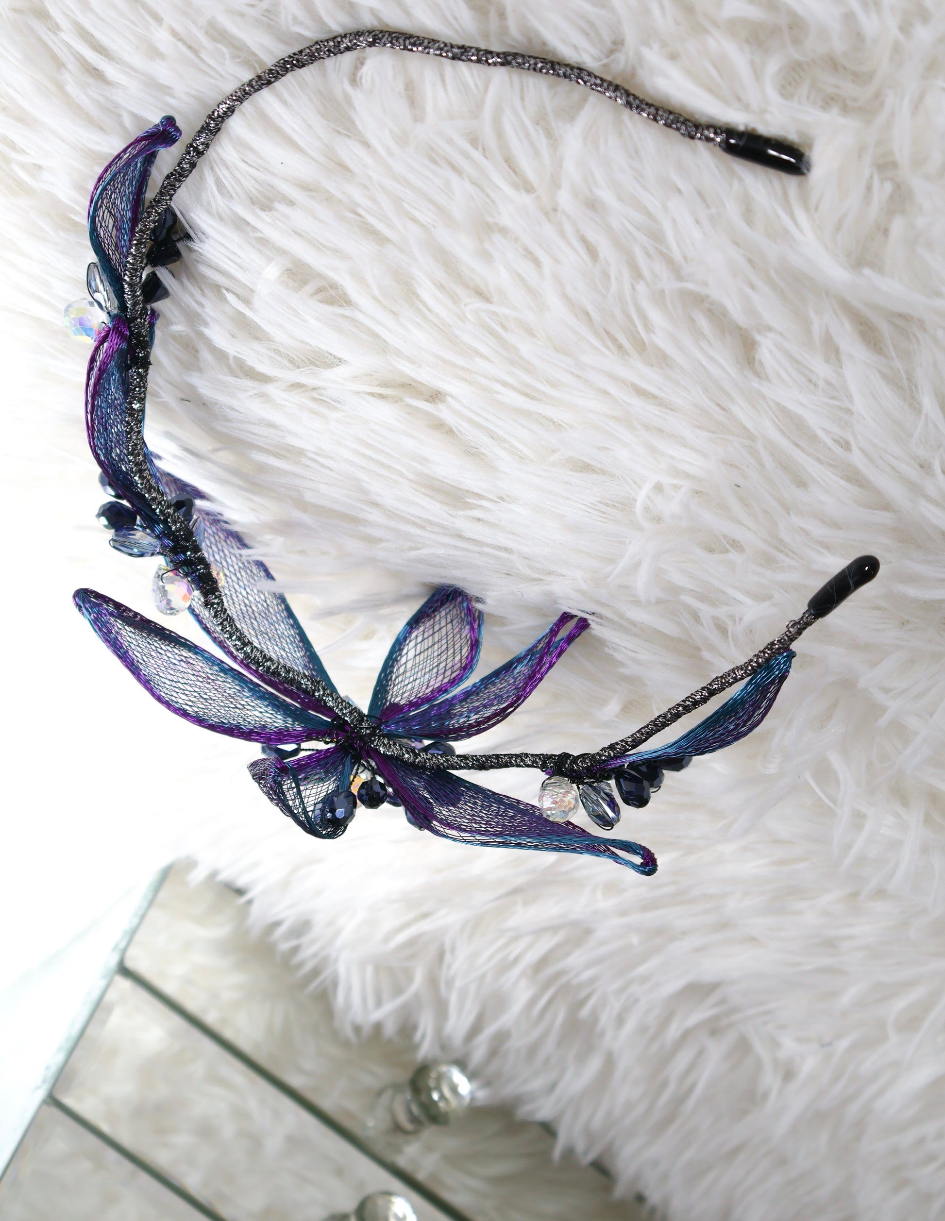 夜空のような深みのあるブルーとパープルのグラデーションに、繊細なラメの花びらと煌めくクリスタルがきらりと輝くカチューシャ。