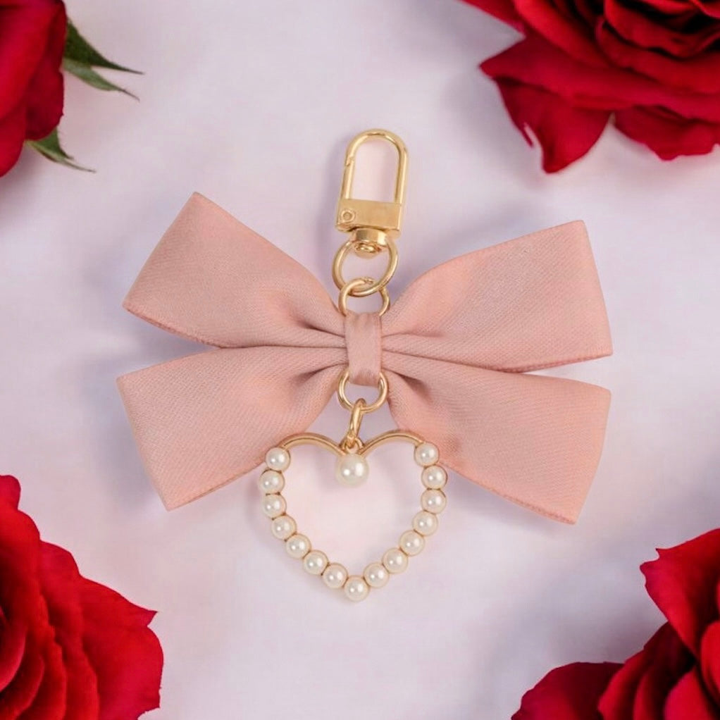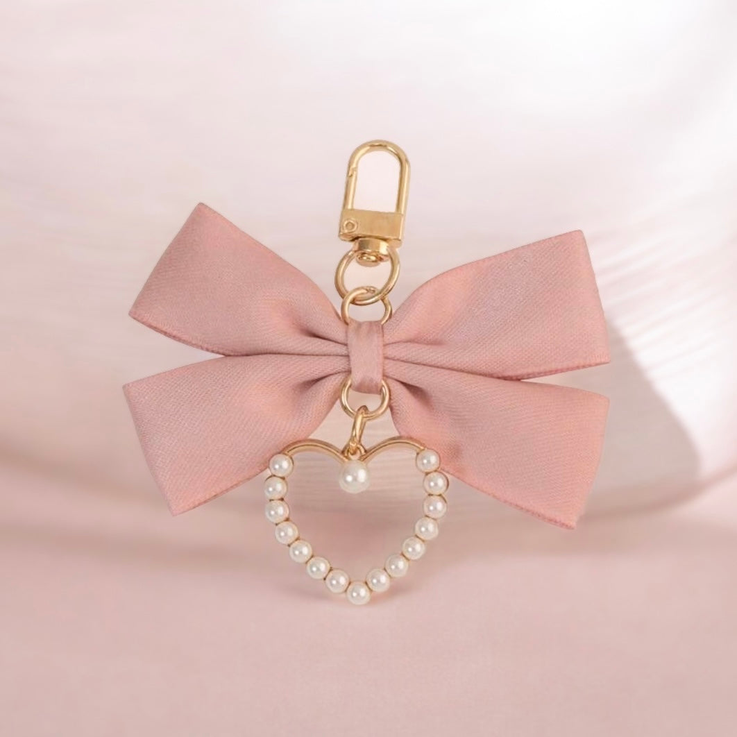 やわらかなリボンに、パールをあしらったハートチャームを添えた上品でフェミニンな Ruban キーホルダー。