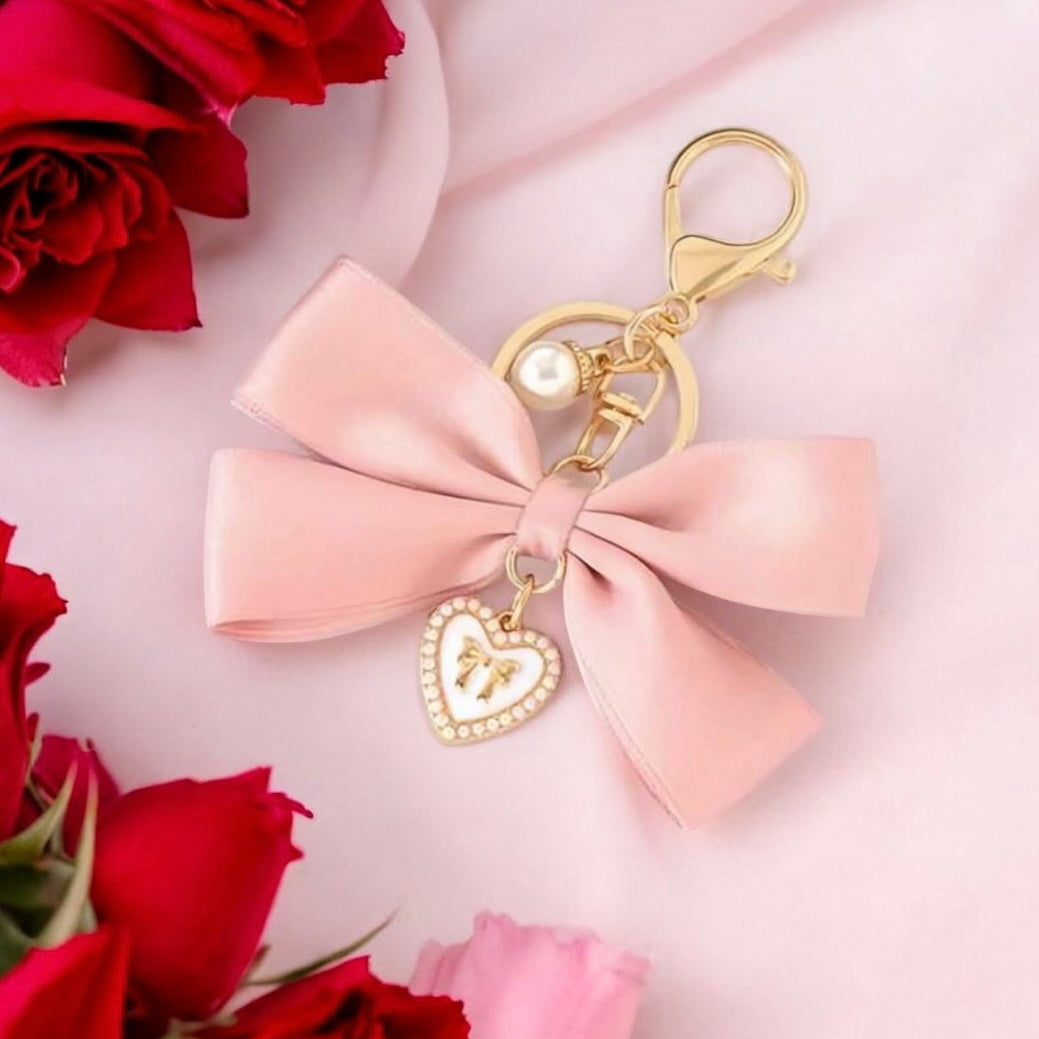 やわらかなピンクリボンに、ハートモチーフのチャームを添えた Ruban キーチャーム。